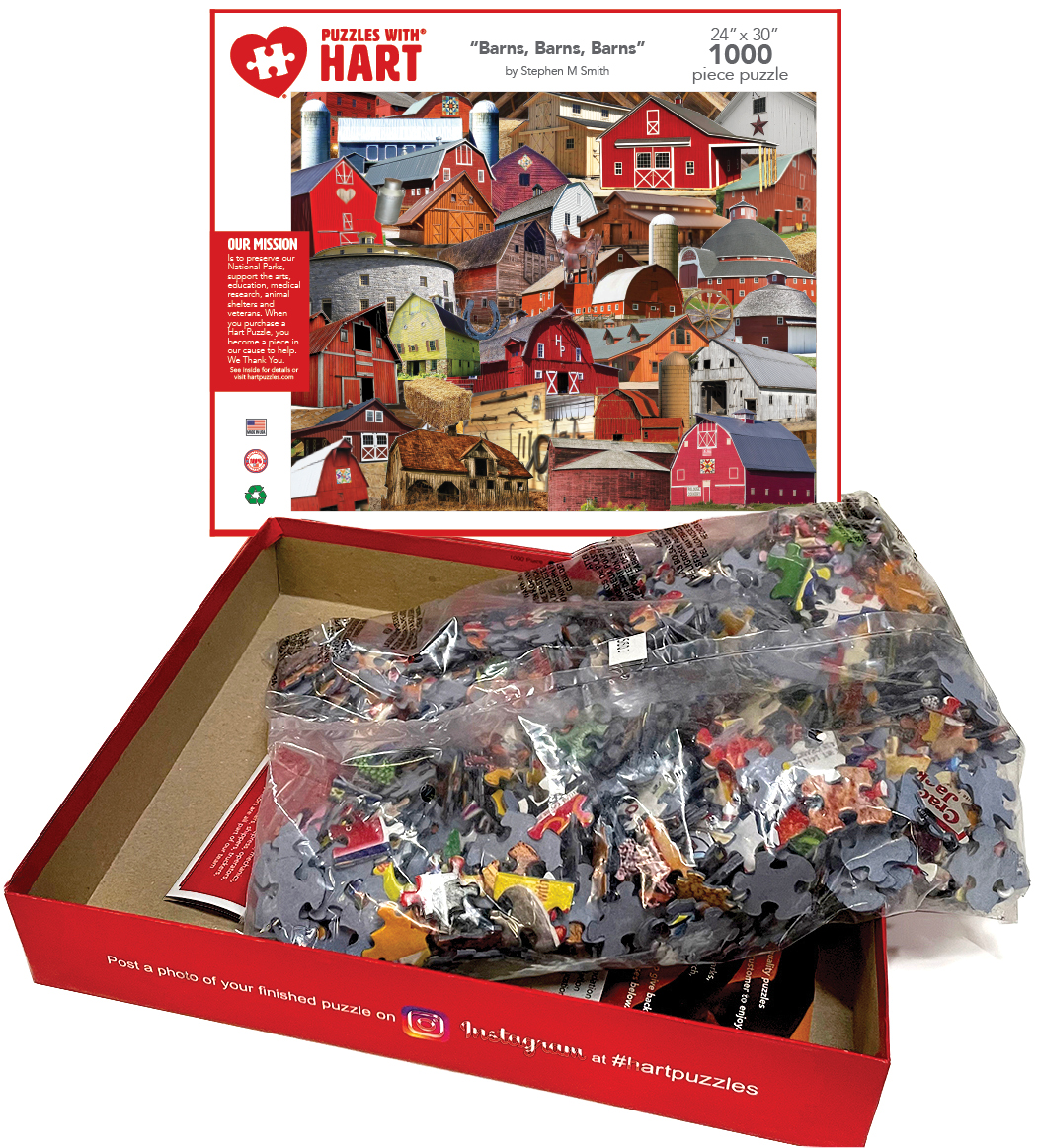 Throughout history the modern barn largely developed from the three aisled medieval barn, commonly known as tithe barn or monastic barn. Today’s modern barns are more typically steel buildings. From about 1900 to 1940, many large dairy barns were built in northern USA with gambrel or hip roofs. As you travel across the USA you can see the New England barn, prairie barns, round barns, new world Dutch barns, cantilever barns, even the simple pole barn. All dotted throughout our agricultural landscape in this 24″x 30″ 1000 piece puzzle. By Stephen M Smith
