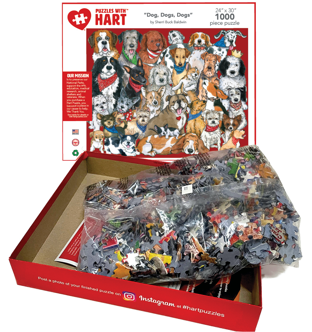 Basset Hounds, Bulldogs, Corgis, West Highland Terriers and a Heinz 57. All your favorite breeds brought to life with Sherri’s unique illustration style that brings so much character to our best friends. Look for your favorite in this 24”x 30” 1000 piece puzzle. By Sherri Buck Baldwin