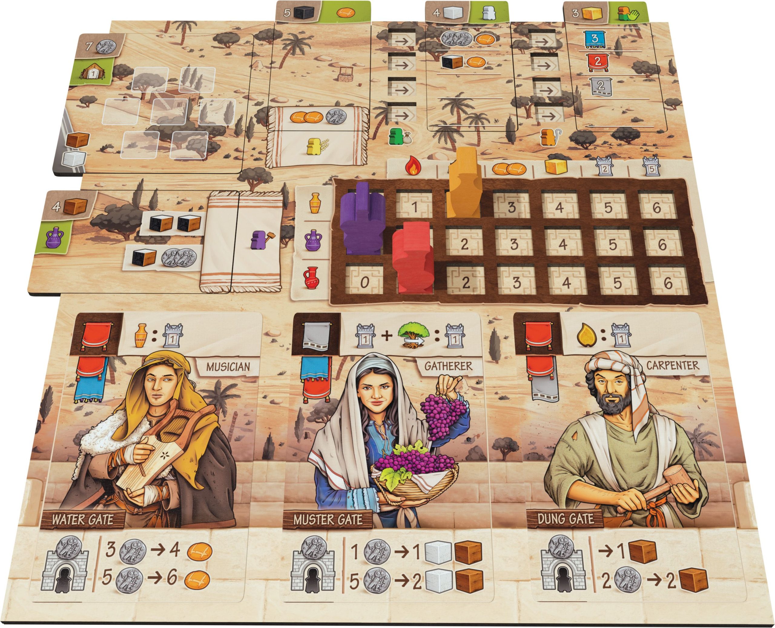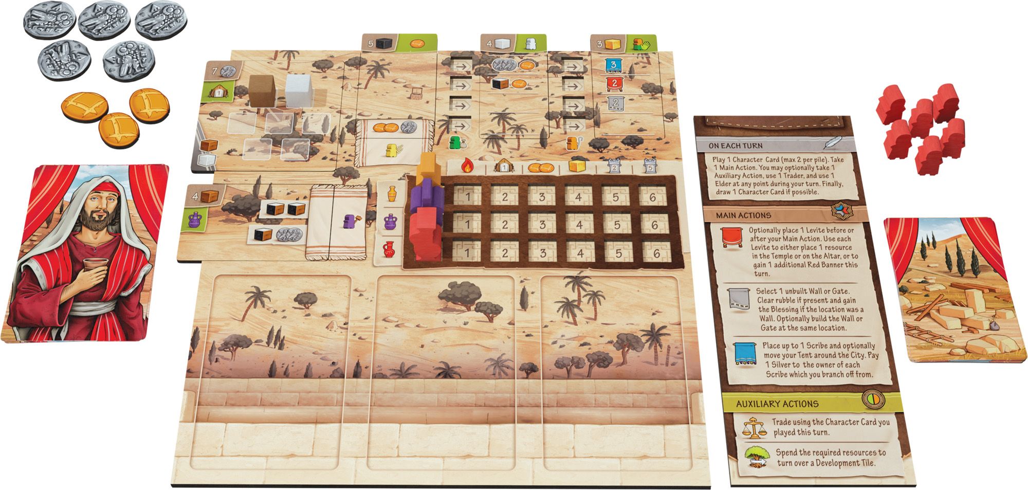 Ezra and Nehemiah is a thematic strategy game for 1-4 players, set in ancient Jerusalem. Players will be building the temple and city walls, and teaching the Torah to returning exiles. Players may also seek to develop their land, travel to settlements outside the city walls, or stoke the altar’s fire to keep it burning day and night. The prophets, Haggai and Zechariah will be doing their part to keep the people focused on what is most important. Over three weeks (rounds), players will be using their hand of cards, workers, and resources to do their part in rebuilding the great city of Jerusalem. After six days of work, there will be a Sabbath day of rest. Food will be needed, and the week’s workwill be reflected upon. The game will end after the third Sabbath has been completed