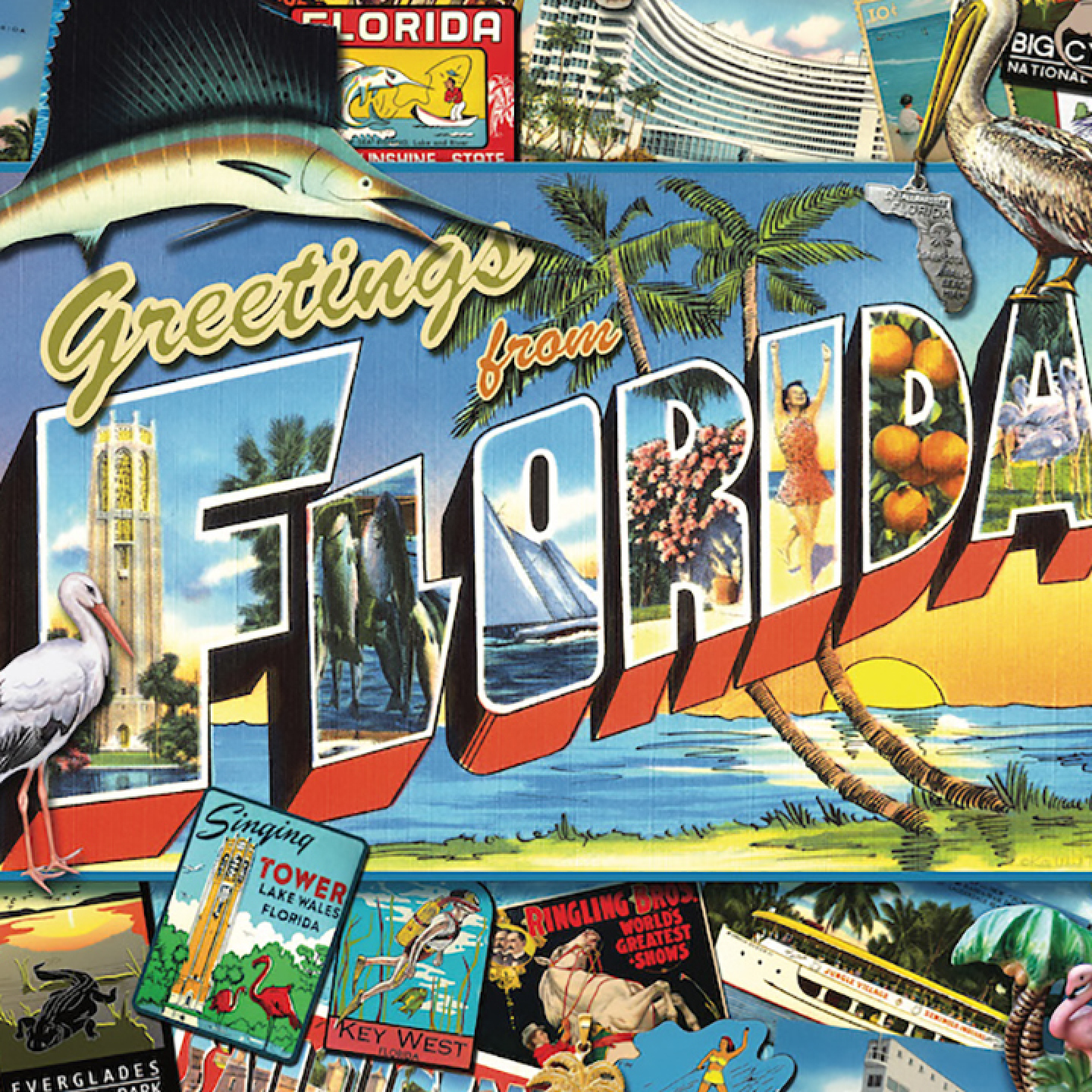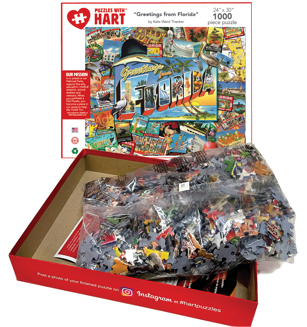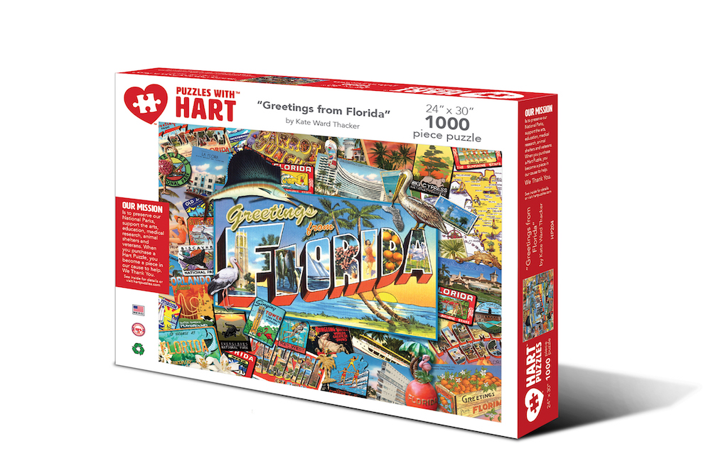 Admitted to the Union March 3, 1845, Florida is our southernmost contiguous state, bordered to the west by the Gulf of Mexico, to the northwest by Alabama, to the north by Georgia, to the east by the Atlantic Ocean and the Straits of Florida to the south. Take in all the Sunshine State has to offer in this 24”x 30” 1000 piece puzzle. By Kate Ward Thacker