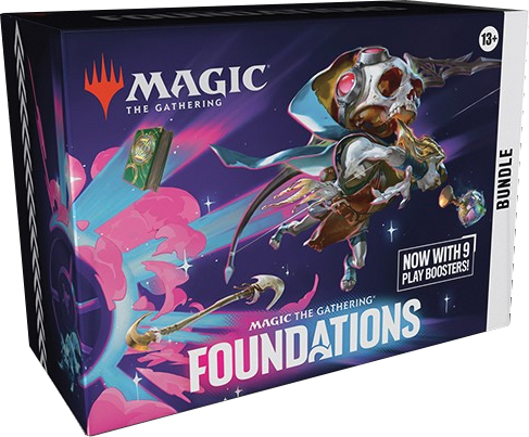 Whether you’re treating yourself or a lucky fan in your life, you can’t go wrong with a Foundations Bundle full of cards and accessories. Meet Magic’s most popular characters, raise zombies or cats, and strategically command armies or ancient power; this set covers Magic’s greatest hits and it’s the perfect way to start playing with your friends. The best time to play your first Magic game is now. Dive into Foundations to create and share your quintessential Magic: The Gathering experience playing with and collecting cards selected to give every player the advantage. In this Bundle you’ll find 9 Foundations Play Boosters (each containing 14 cards), plus 1 Traditional Foil card with Bundle-exclusive alternate art, 20 Traditional Foil Basic Land cards (10 with Full Art), 20 nonfoil Lands (10 with Full Art), 1 oversized Spindown life counter, 1 Foundations card storage box, and 2 reference cards.
