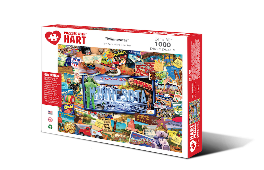 Known as the “Land of 10,000 Lakes”, Minnesota is the 12th largest in area and the 22nd most populous. Minnesota’s growth initially centered on timber, agriculture and railroads. During the mid-19th and early 20th centuries, European immigrants arrived in significant numbers, particularly from Scandinavia, Germany, and Central Europe. Come visit and experience a little “Minnesota nice”, oh, you ‘betcha in this 24″x 30″ 1000 piece puzzle. By Kate Ward Thacker