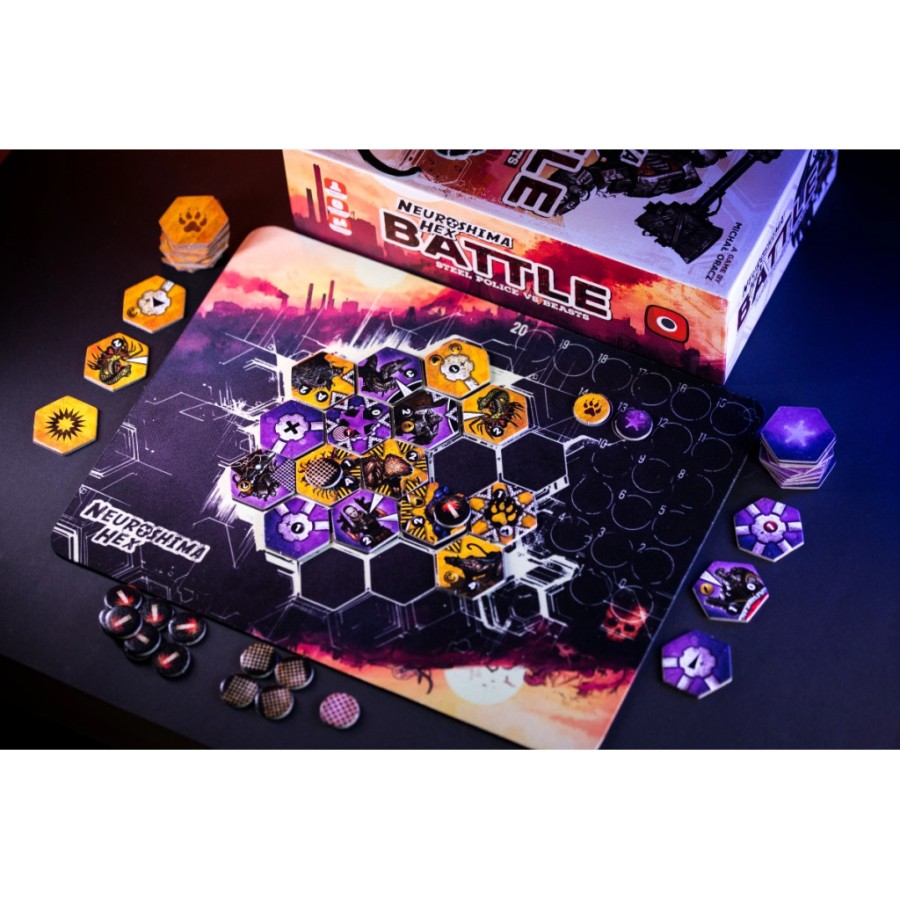 Neuroshima Hex: Battle is a fast-paced and dynamic version of Neuroshima Hex designed for two players to enter this rich world. The box features the armies of Steel Police and Beasts. The Steel Police brings law and order fanatics clad in experimental power armor with a unique reflection ability that turns enemy attacks back on them. The Beasts represent feral survivors of Moloch’s attack, introducing friendly fire mechanisms and a primal, unpredictable style of play. Both factions add unique strategies and flavor to this intense two-player experience. The game includes a playing mat, two armies, tokens, and a new rulebook.