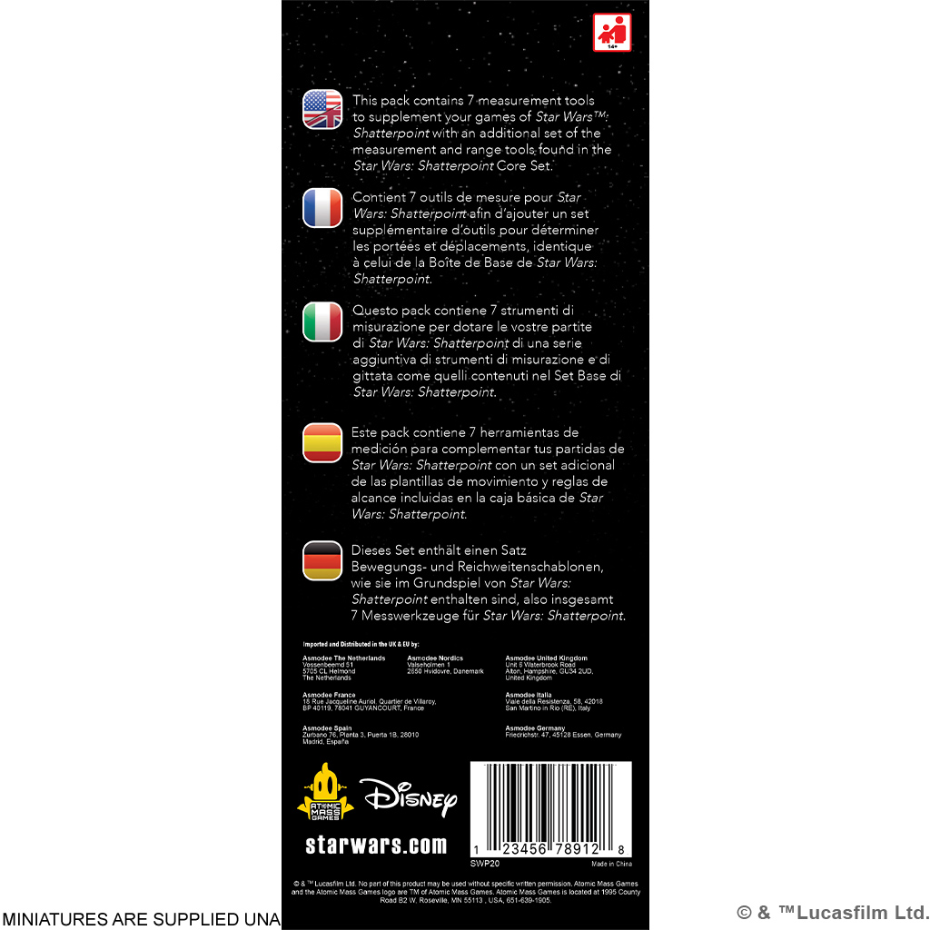 This pack contains four range tools and three movement tools for player to supplement their games of Star Wars: Shatterpoint with more of the range and movement tools found the Core set.