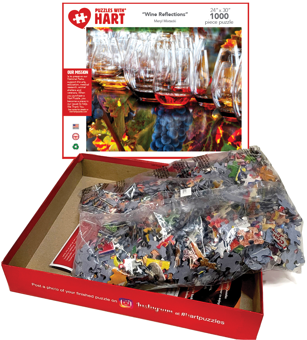 Wine glasses have never looked so good nestled in with the grapes in this amazing photograph. Enjoy the ‘Nectar of the Gods’ while reflecting in this 24″x 30″ 1000 piece puzzle. By Meryl Mixtacki