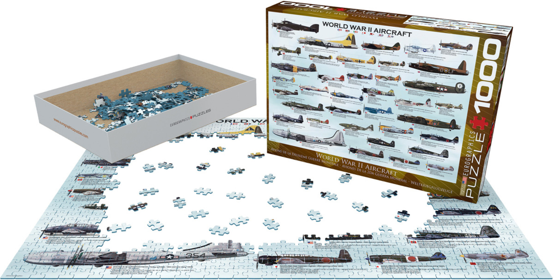 This unique jigsaw puzzle features aircraft of both the Allied and Axis forces, including many of the greatest warbirds such as the Hurricane, the Supermarine Spitfire, the Messerschmitt BF-109 and the Boeing B-29 SuperFortress.