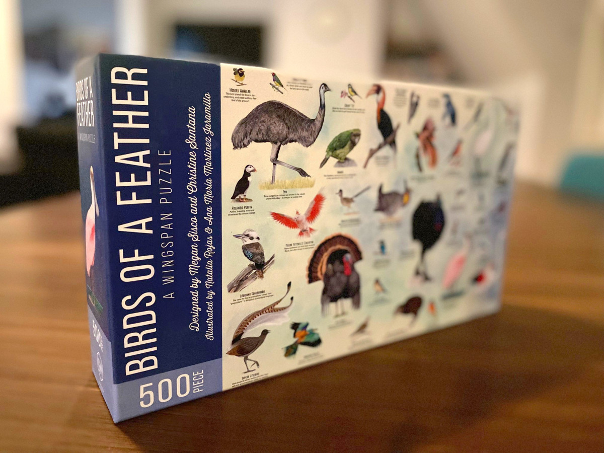 Birds of a Feather is a beginner-level 500-piece jigsaw puzzle designed specifically for Wingspan by Megan Sisco and Christine Santana, with a completed size of 54cm (wide) by 38cm (high).