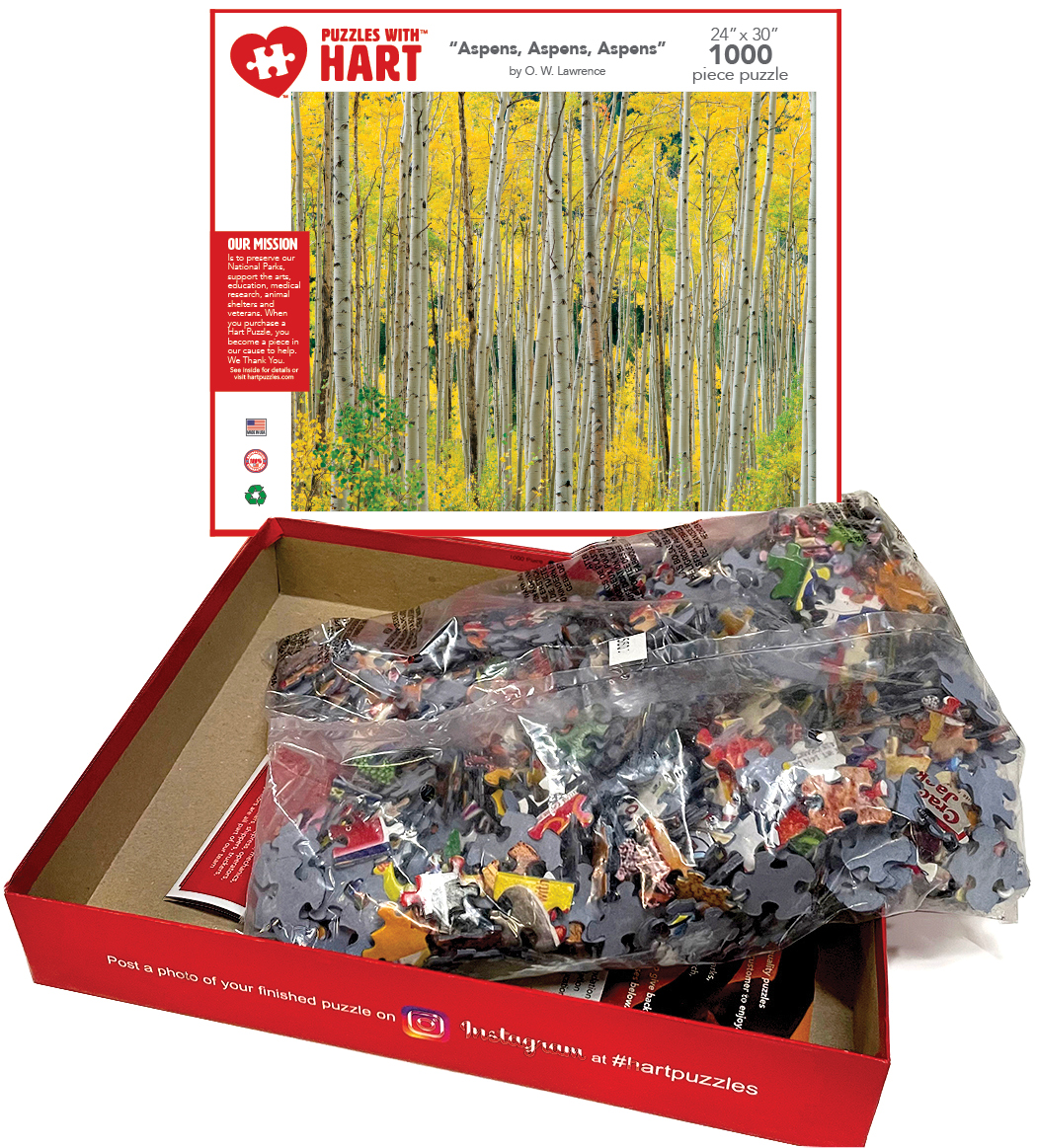 Populus tremuloides – Quaking aspen or trembling aspen, common in northern and western North America. Known for its vibrant yellow in the fall, the tall, tube-like clusters of white stands and the sound of the “quaking” leaves. Aspen groves are considered a single organism with an extensive shared underground root system that can cover entire counties and even cross state lines. Enjoy the bright yellow colors in this 24″x 30″ 1000 piece puzzle. By O W Lawrence