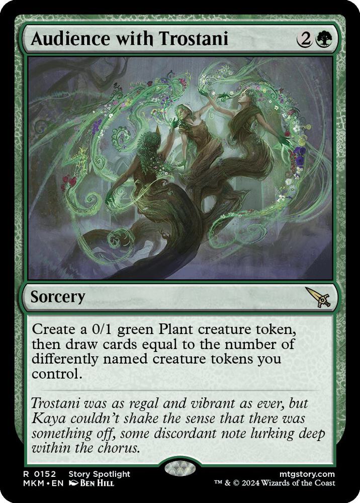 Create a 0/1 green Plant creature token, then draw cards equal to the number of differently named creature tokens you control.