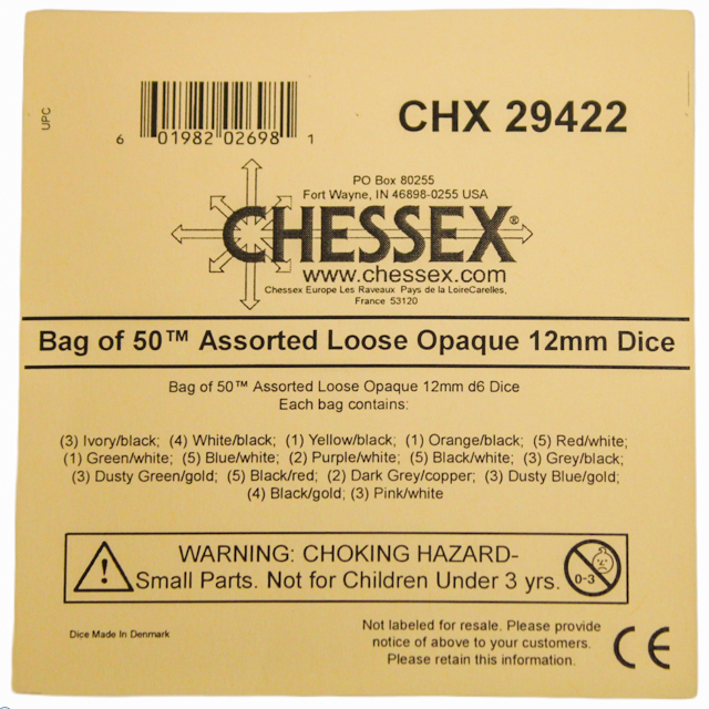 Each bag contains 50 Opaque 12mm d6 dice with pips in the following colors: