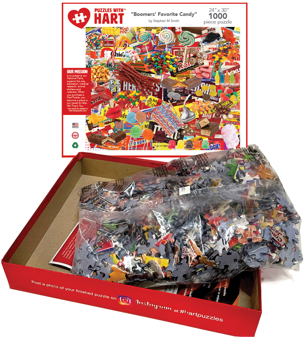 Hey, you got chocolate in my peanut butter! All your favorite sweets wrapped up. See if you can find your favorite candy in this 24”x 30” 1000 piece puzzle. By Stephen M. Smith