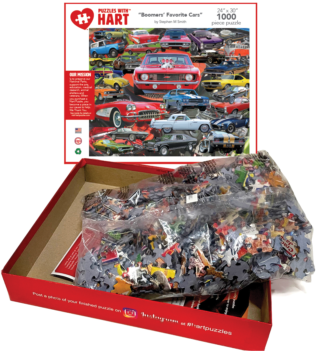 Hot rods, muscle cars and just plain cool cars. These are the cars we saw on the streets with lots of horsepower, torque and real sleek design. Lay a patch with your favorite in this 24”x 30” 1000 piece puzzle. By Stephen M. Smith