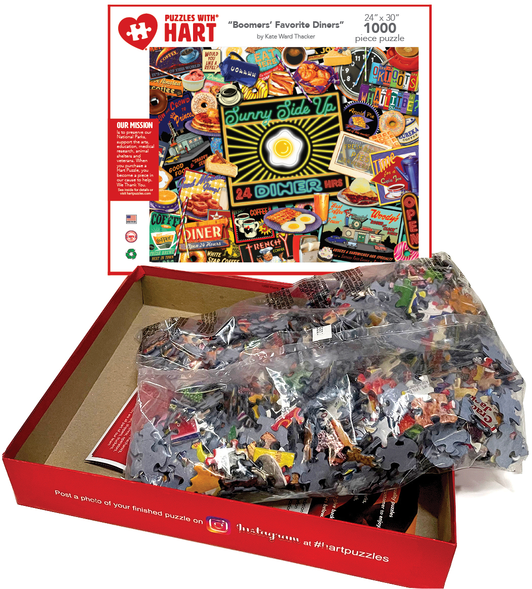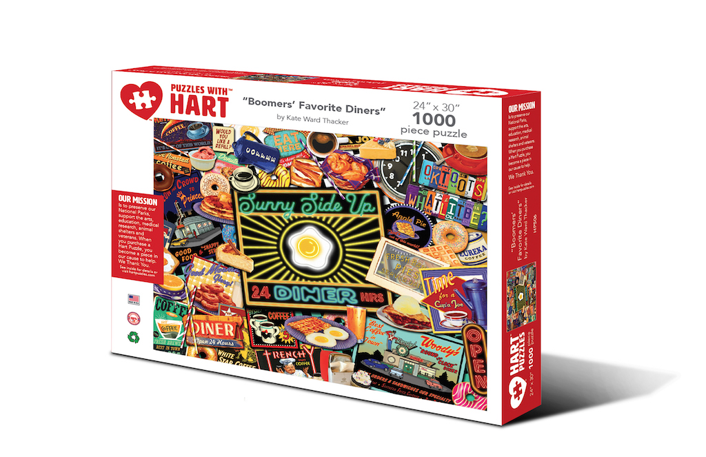 The classic American roadside diner. Usually made from a converted train car, serving up comfort food with a hot cup of joe and piece of pie. Look for the bright neon signs in this 24”x 30” 1000 piece puzzle. By Kate Ward Thacker