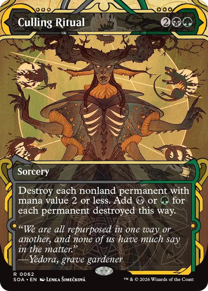 Destroy each nonland permanent with mana value 2 or less. Add B or G for each permanent destroyed this way.