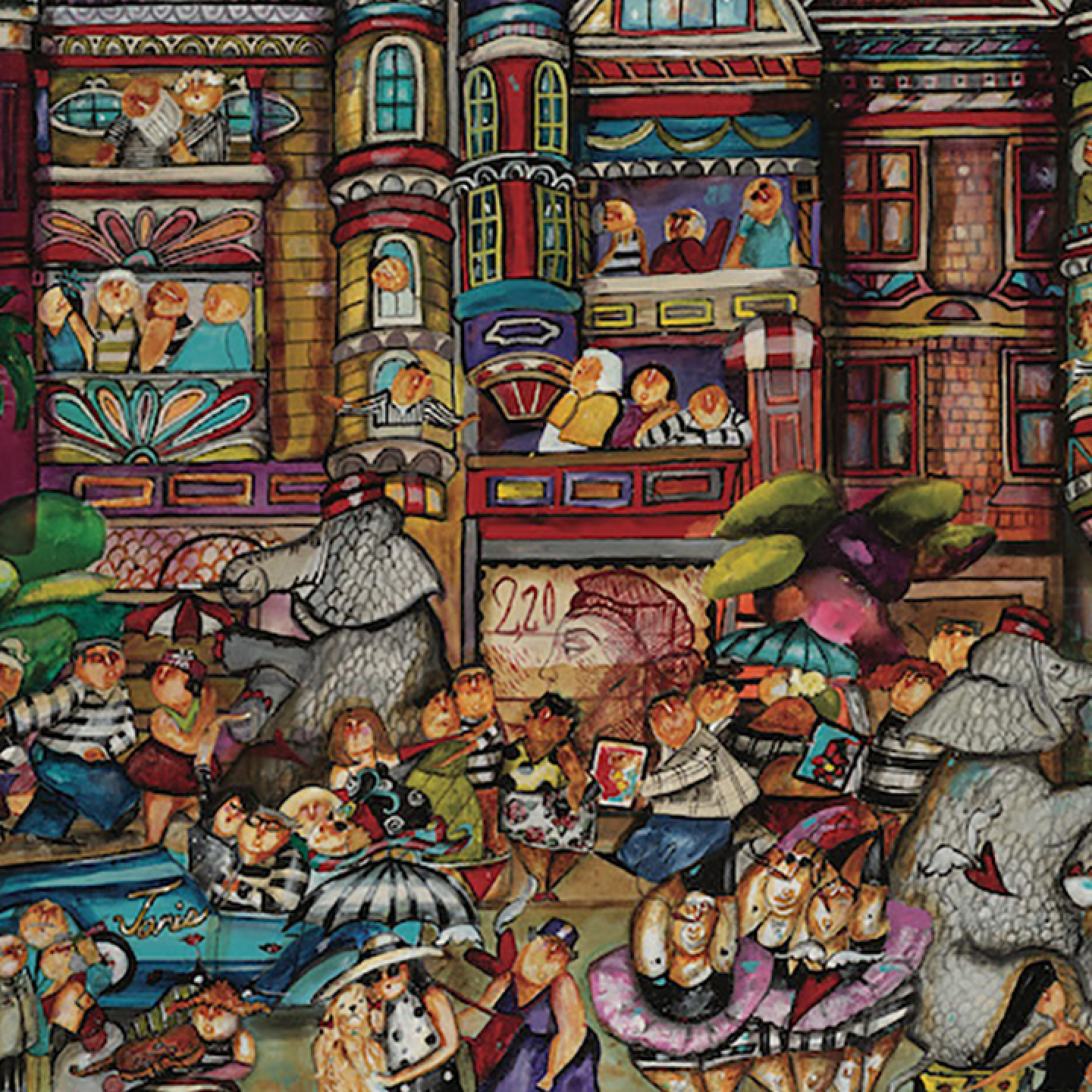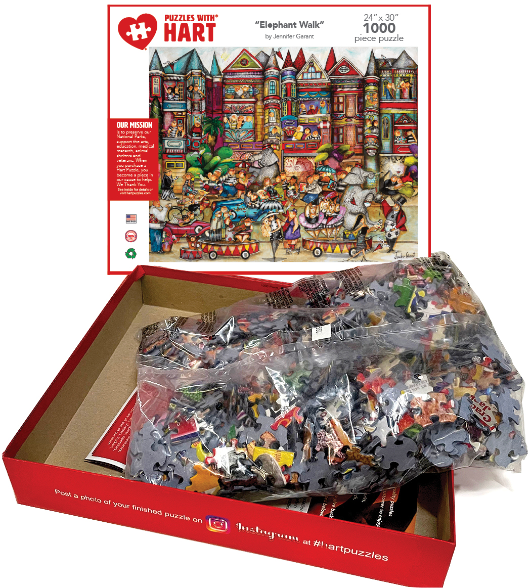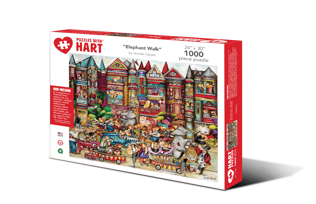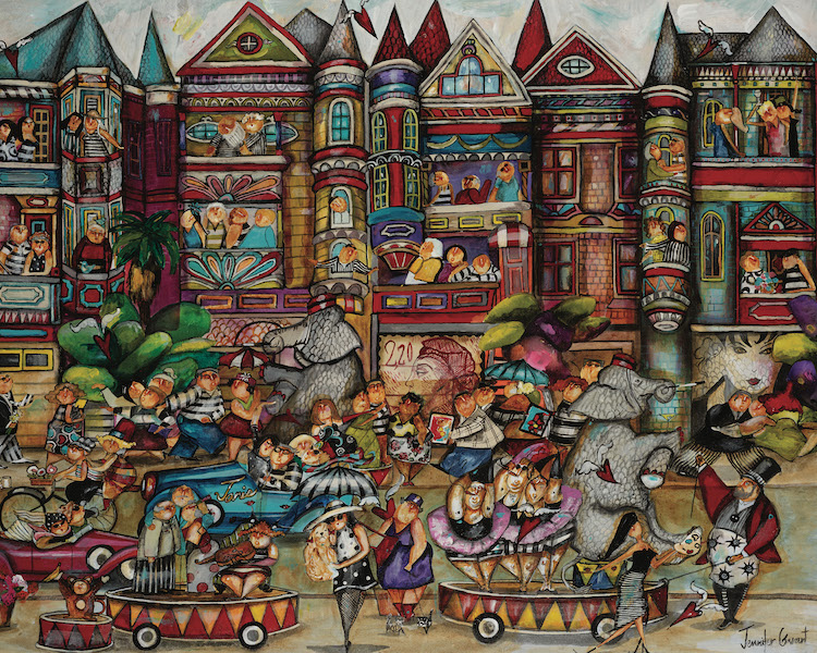 A whimsical parade of all sorts of characters featuring elephants and heart angels in flight in front of the famous ‘Painted Ladies’ in San Francisco. Enjoy this joyous display in this 24″ x 30″ 1000 pc puzzle. By Jennifer Garant