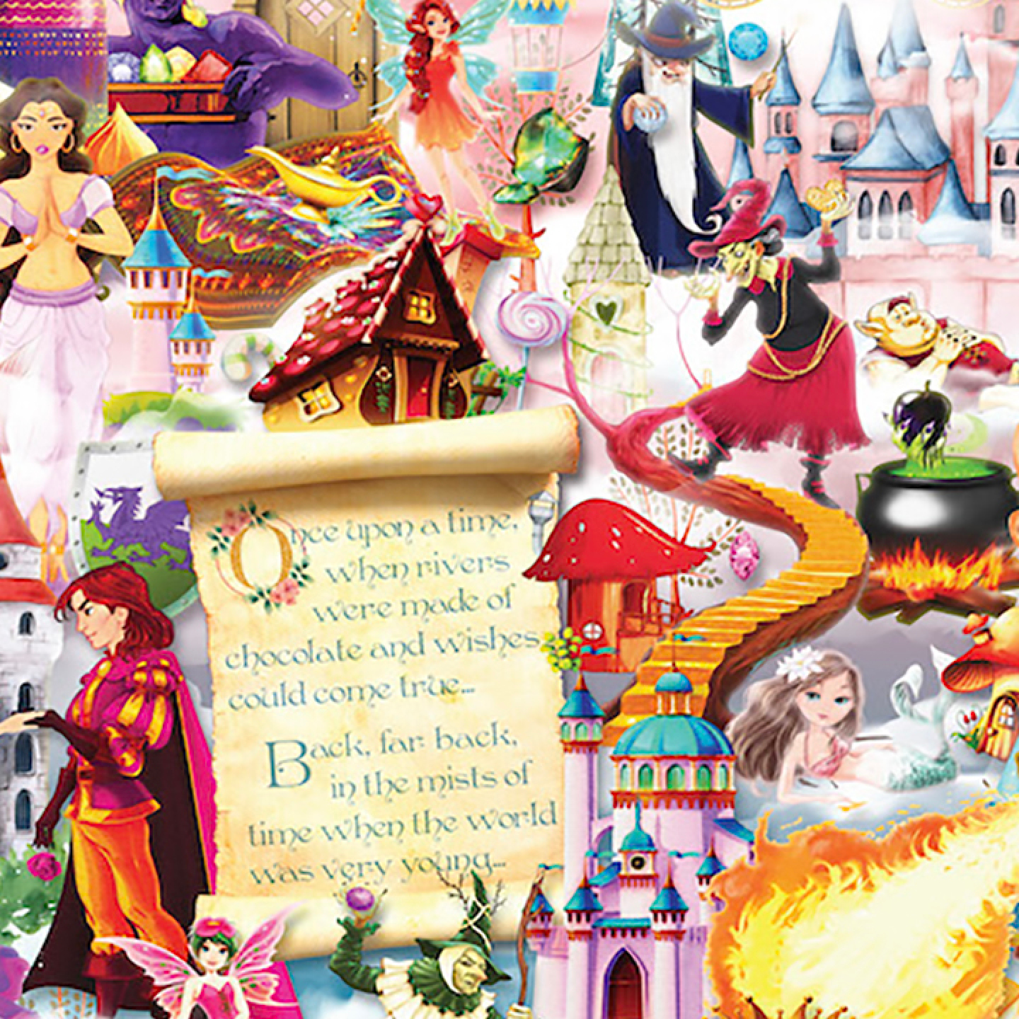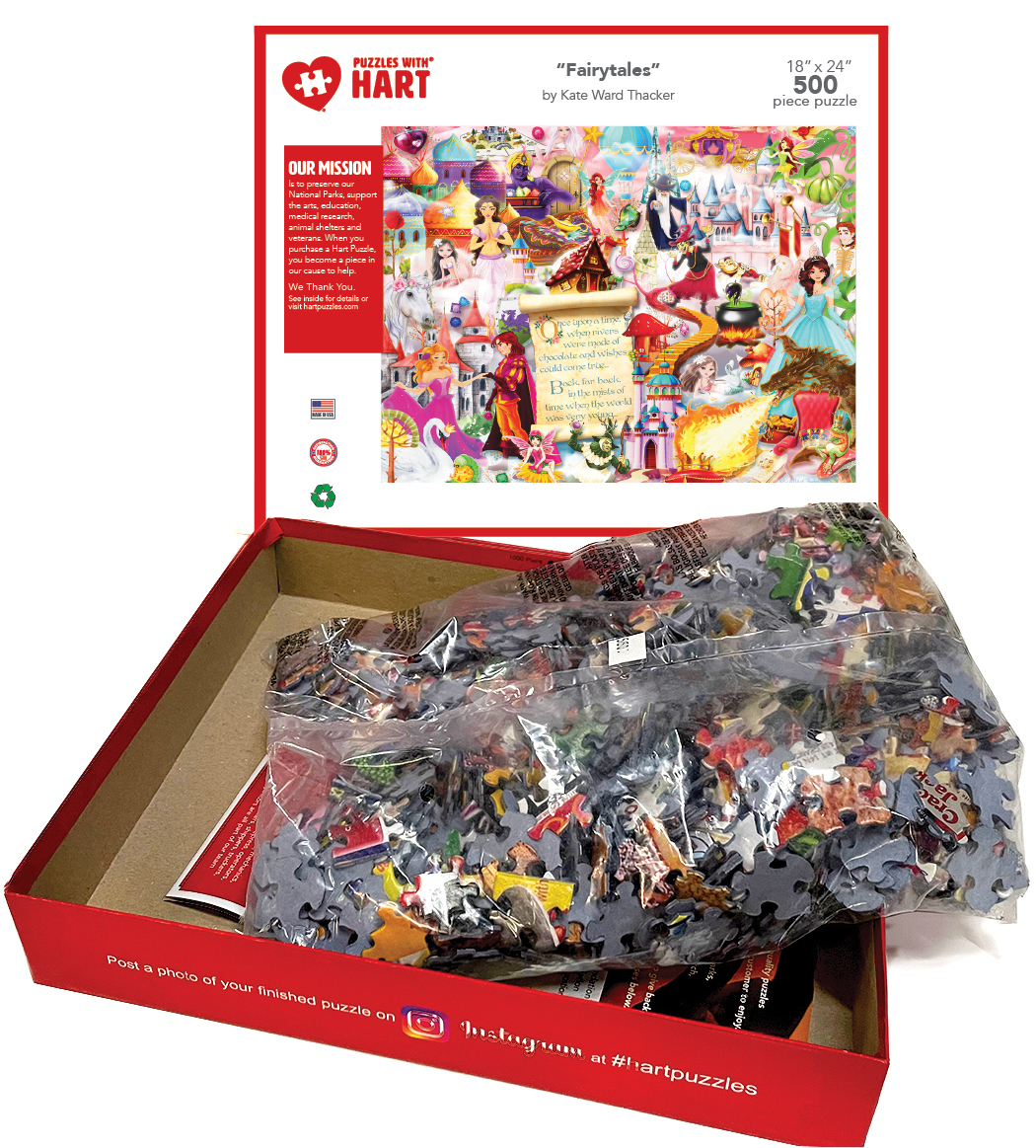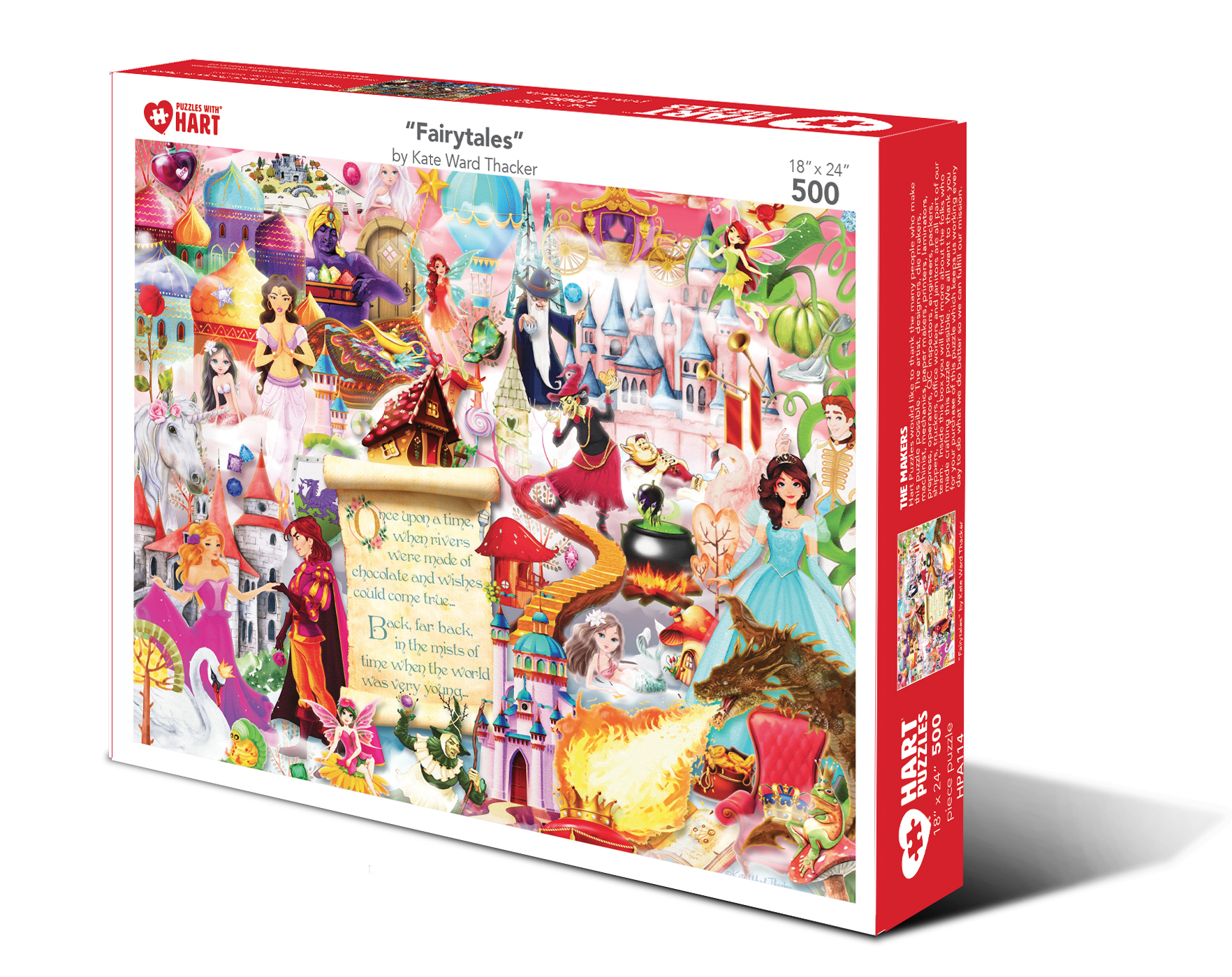 Enjoy magical fairy tales with the enchantments of princesses, princes,elves, fairies, gnomes, talking animals, trolls, unicorns and witches in this 18”x 24” 500-piece puzzle. By Kate Ward Thacker