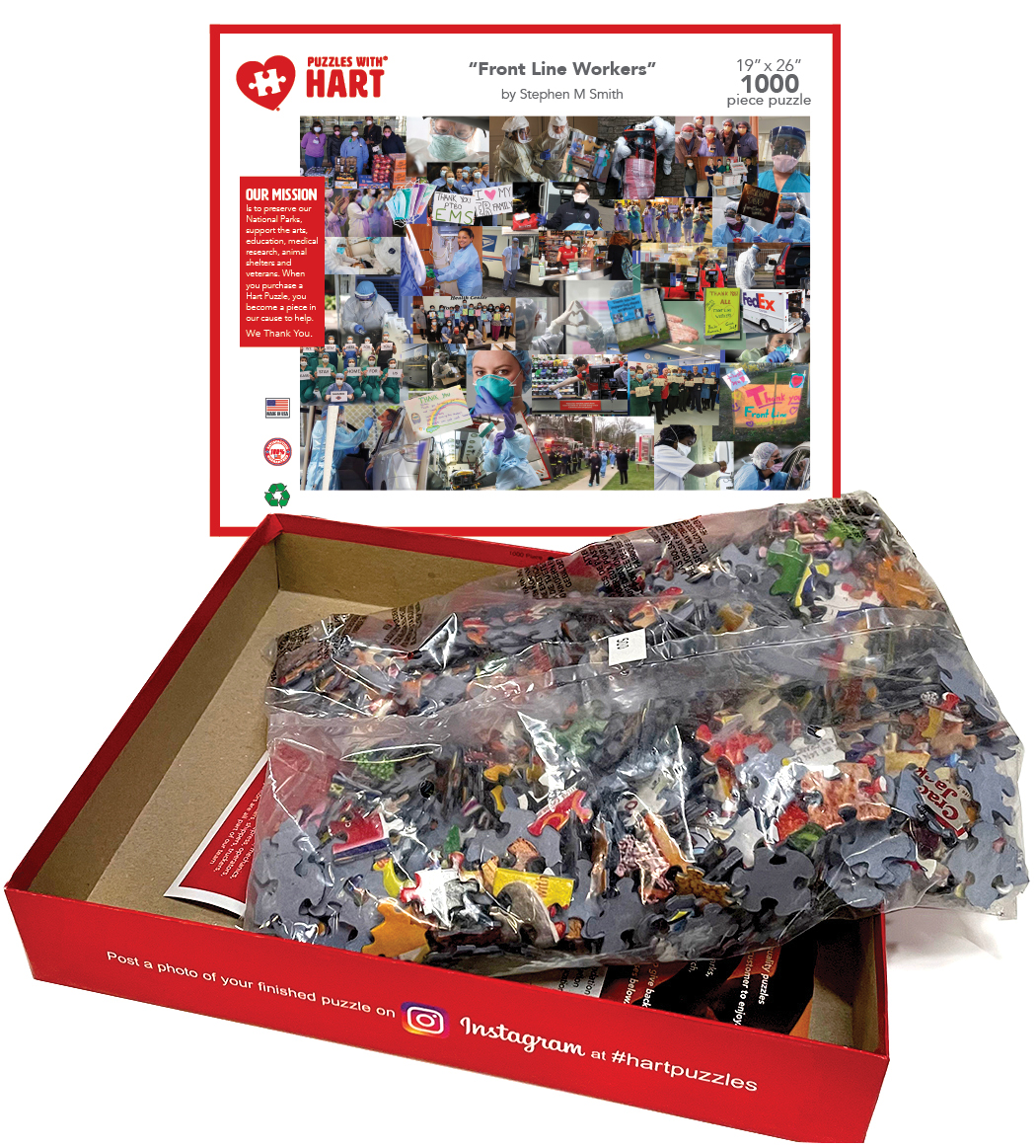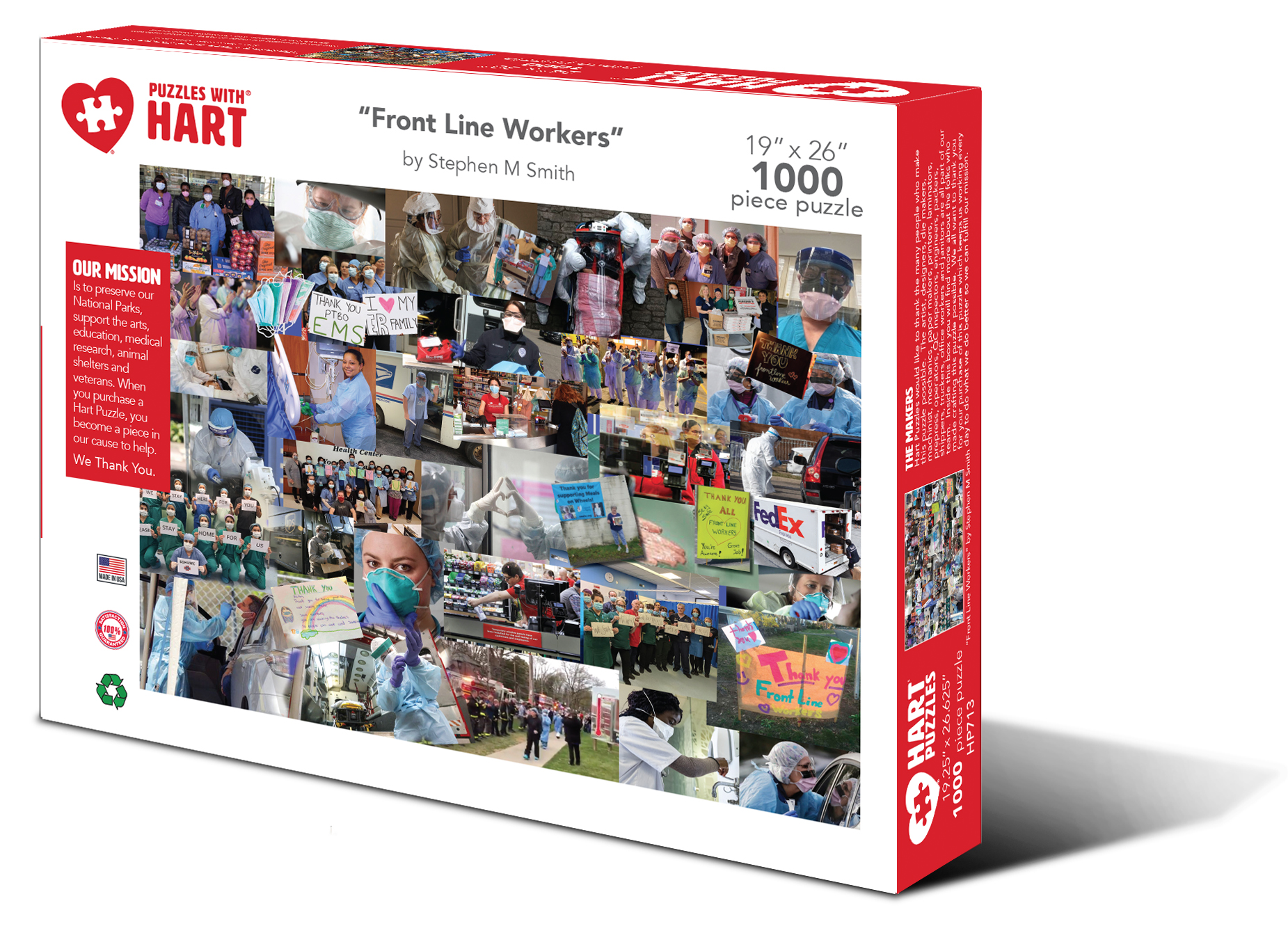 Our Frontline Workers stepped up and took the risk when they were called upon. Their dedication to those they serve is to be commended and we are in awe. Their dedication saved millions of lives and we celebrate them in this 19″x 26″ 1000 piece puzzle. By Stephen M Smith