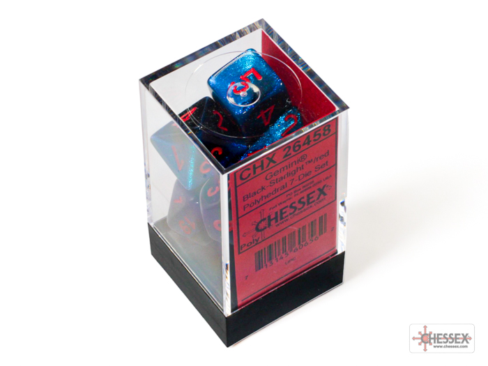 This set contains 7 Gemini Black-Starlight dice with red numbers with the following shapes: