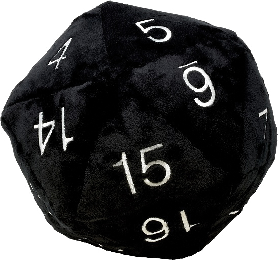 Roll big or go home! This soft jumbo 20-sided dice plush is the perfect addition to casual gaming sessions. Also great for kids and as the conversation centerpiece in your next geek gathering! Made with black ultra-soft, fuzzy fabric with stitched on numbers in silver. Measures approximately 10` in diameter and each side is reinforced with felt backing for improved shape retention.