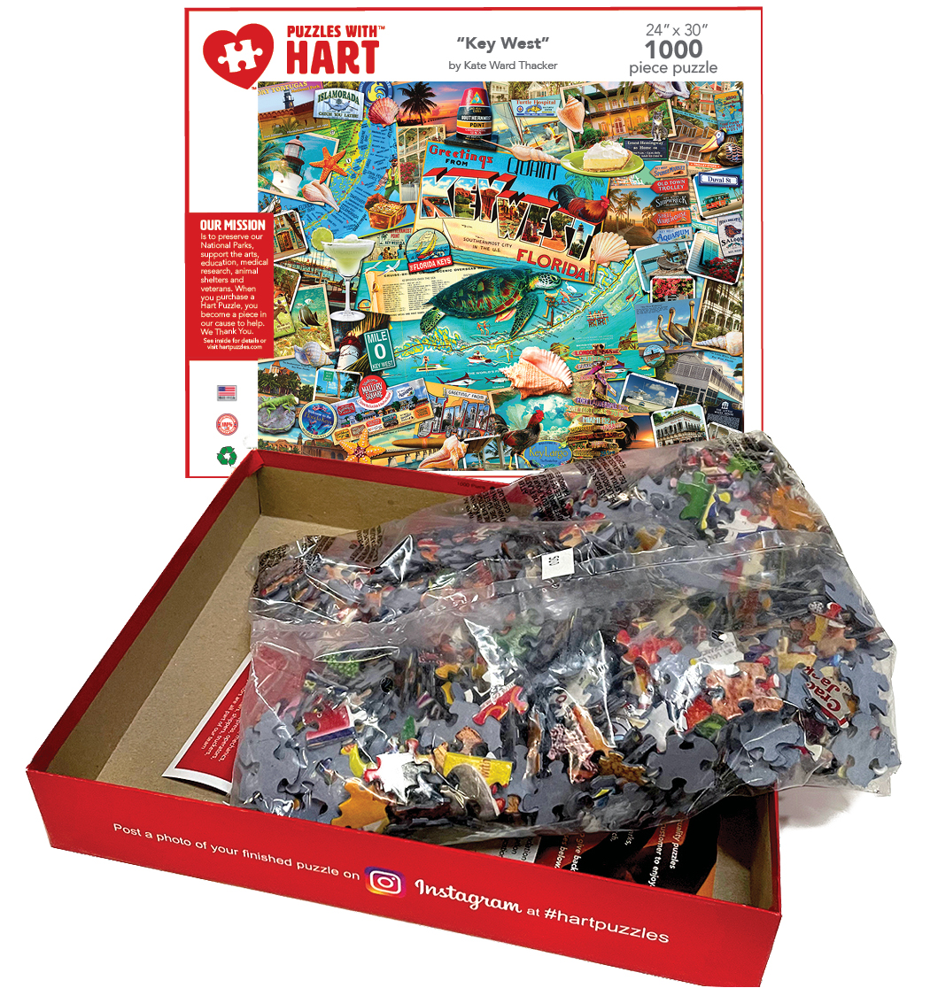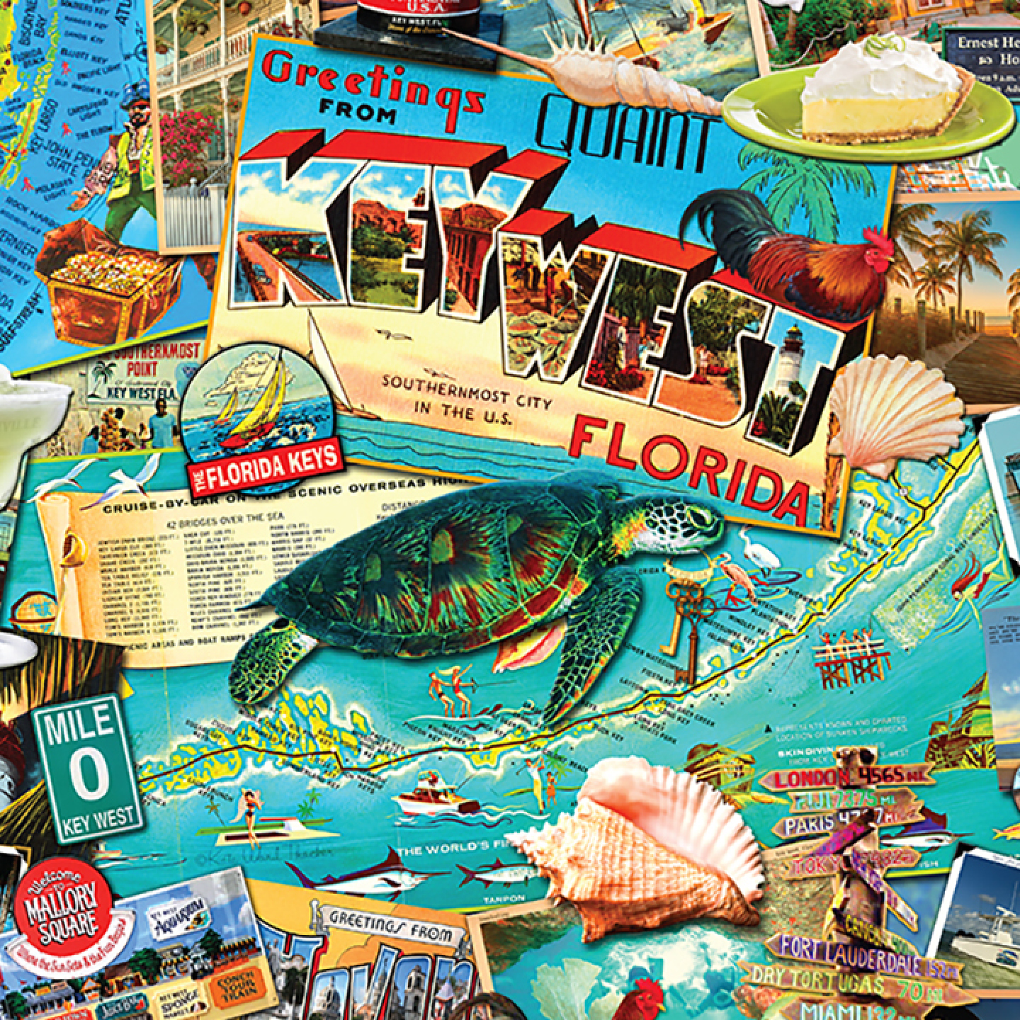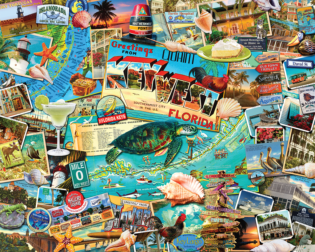 Southern most point in the USA and only 90 miles from Cuba was long a place for fisherman, traders, pirates and treasure hunters. Today it is a island paradise bordered by both the Atlantic’s and Gulf’s warm turquoise waters. Drive on the 7-mile bridge, have some key lime pie, catch a marlin, see Margaritaville up close and more all in the Conch Republic in this 24 x 30, 1000 piece puzzle. By Kate Ward Thacker