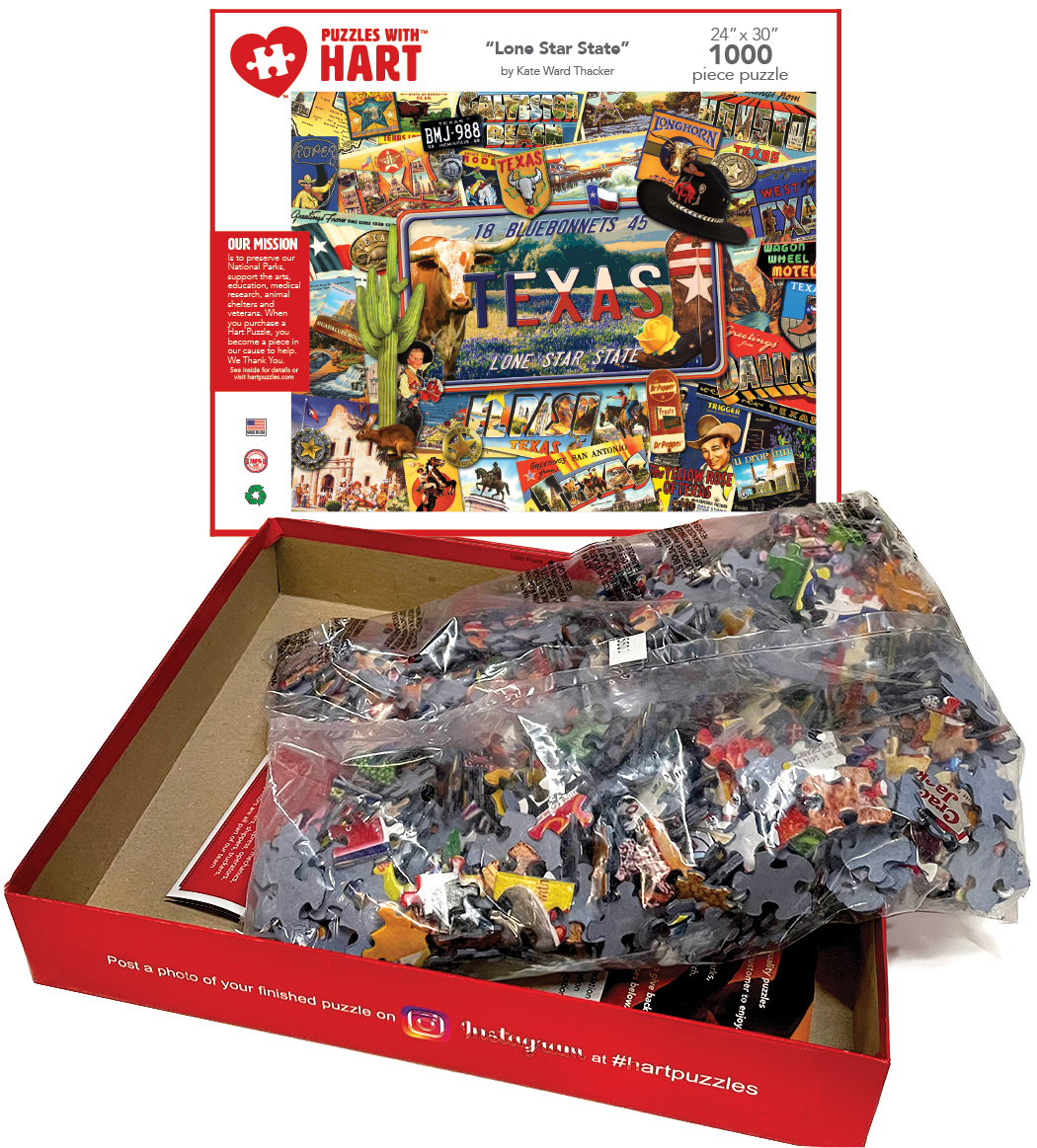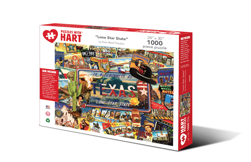 Texas or Tejas, is the second largest state in the United States and is nicknamed the “Lone Star State” for its former status as an independent republic, and as a reminder of the state’s struggle for independence from Mexico. Say “Howdy” to bold graphics and Texas scenery in this 24”x 30” 1000 piece puzzle. By Kate Ward Thacker