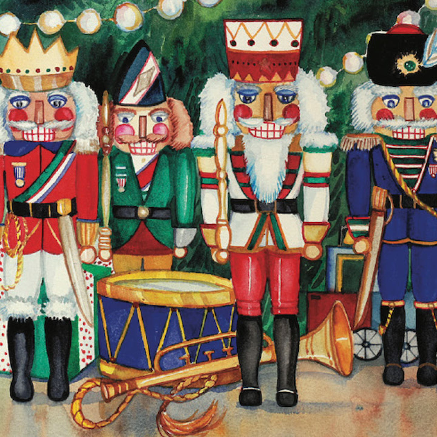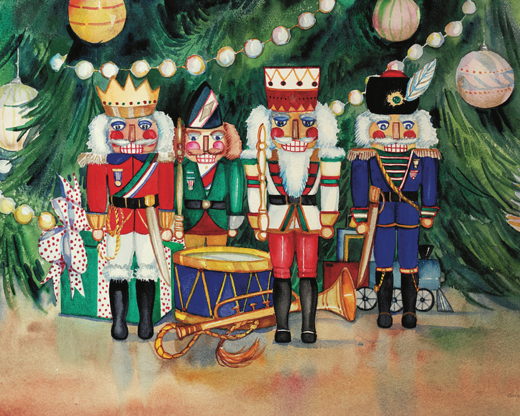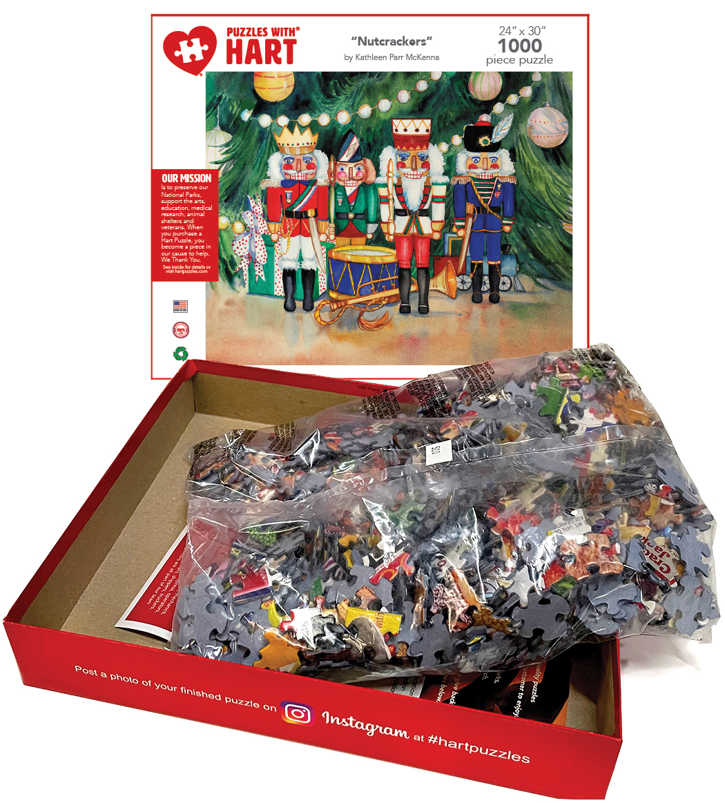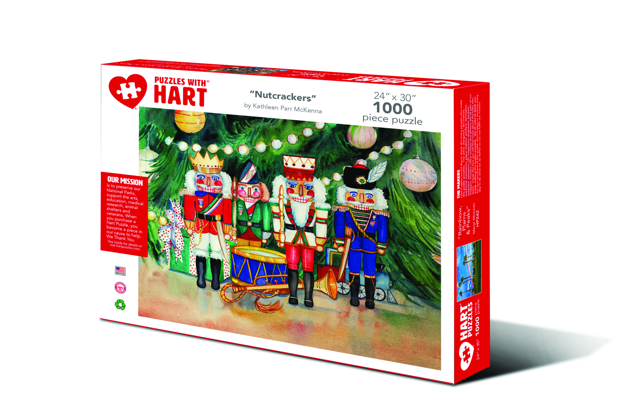 Nutcrackers in the form of wood carvings of a soldier, knight, king, or other profession have existed since at least the 15th century. Figurative nutcrackers are a good luck symbol in Germany, and a folktale recounts that a puppet-maker won a nut cracking challenge by creating a doll with a mouth for a lever to crack the nuts. Decorative nutcrackers became popular in the United States after the Second World War, following the first US production of “The Nutcracker” ballet in 1940. Enjoy the festive music and crack some nuts while completing this 24”x 30” 1000 piece puzzle. By Kathleen Parr McKenna