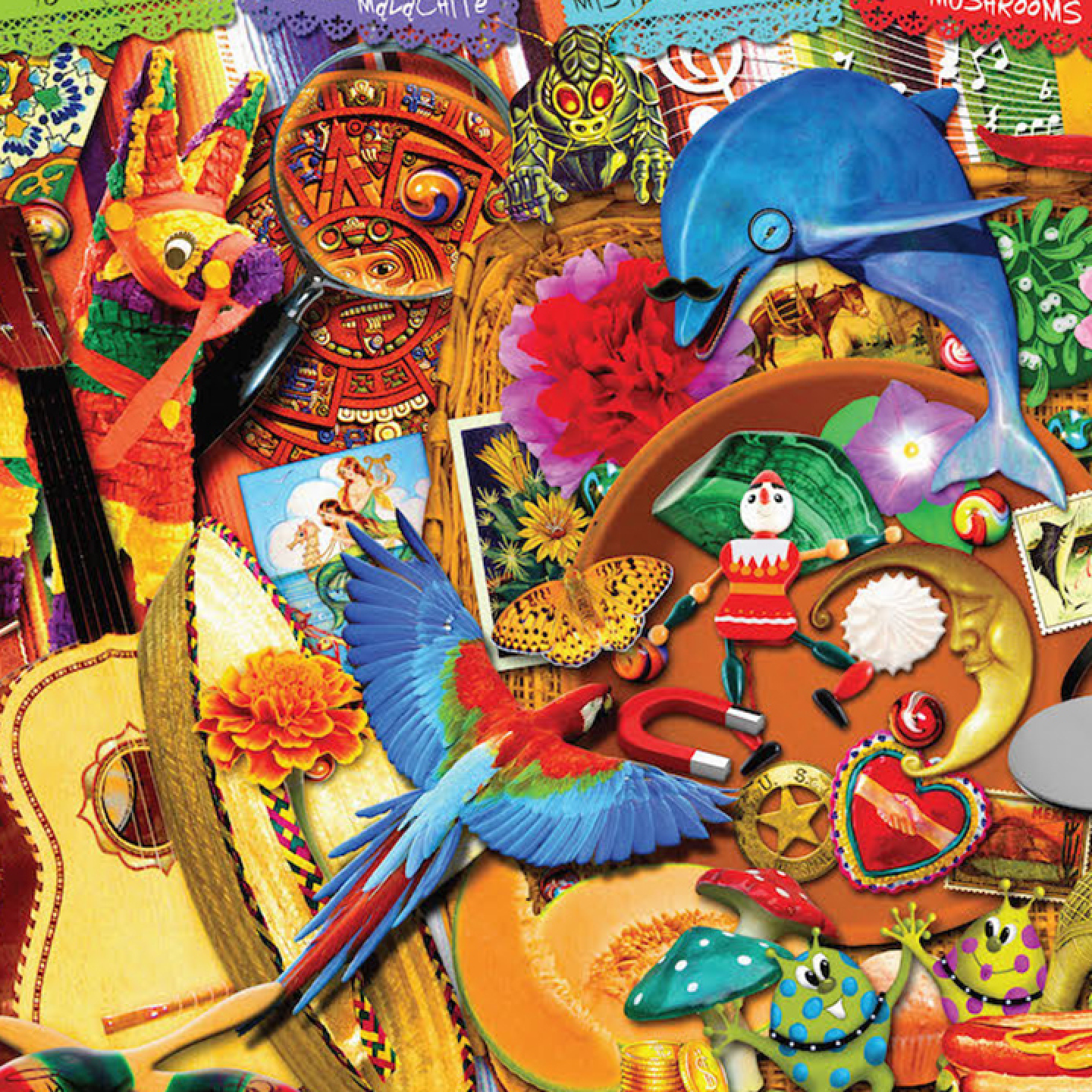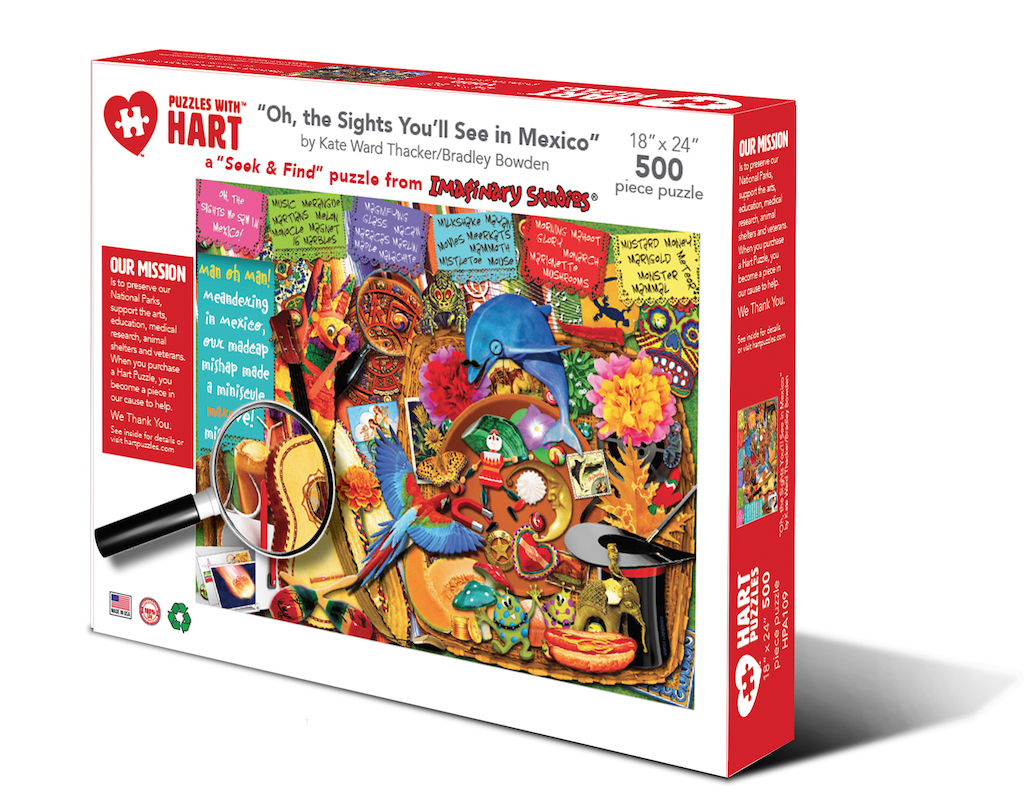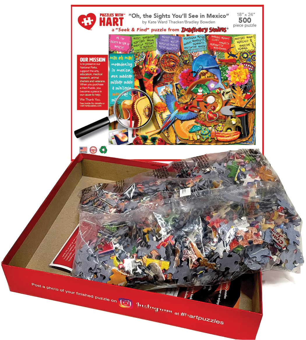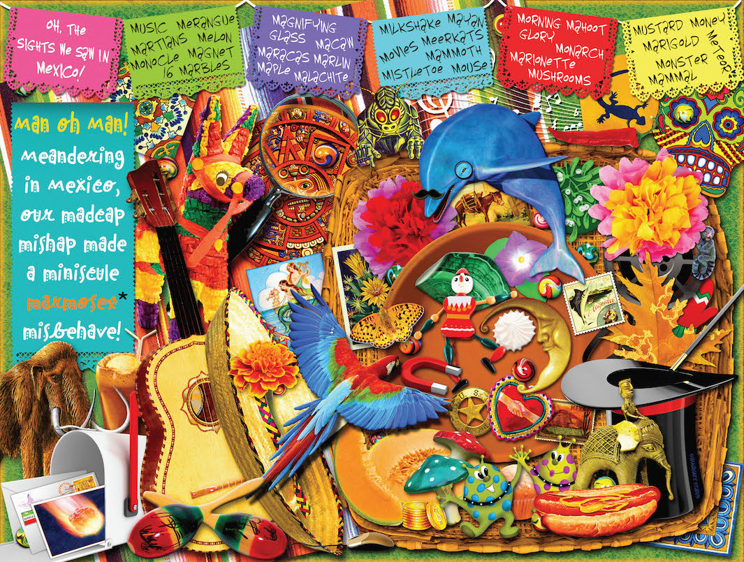 The magical, marvelous, magnificent, musical, multi-faceted Mexico. Explore the Sights of Mexico with the letter 'M' in this Seek & Find puzzle designed by Imaginary Studios. Move through this 18”x 24” 500-piece puzzle designed by Imaginary Studios. By Kate Ward Thacker and Bradley Bowden