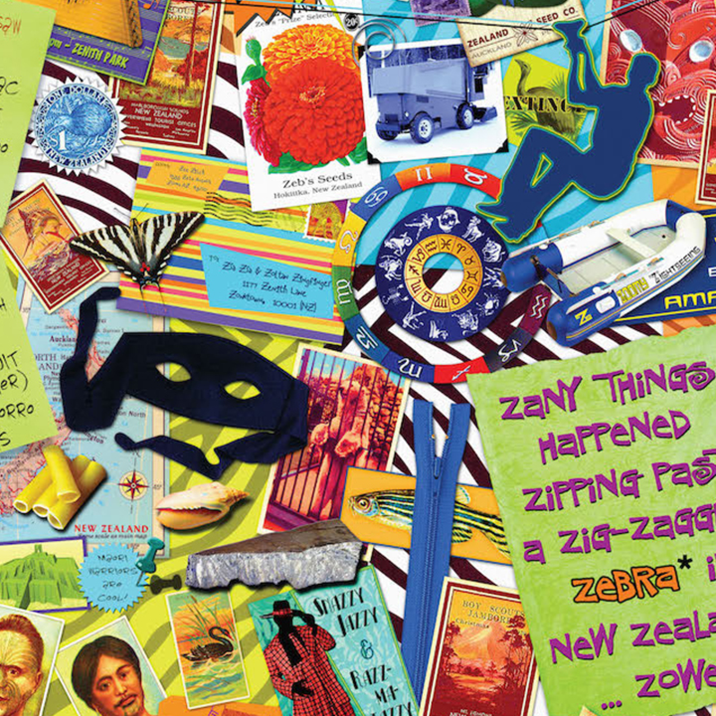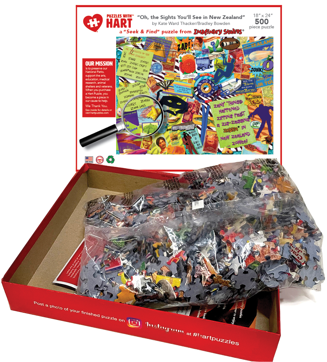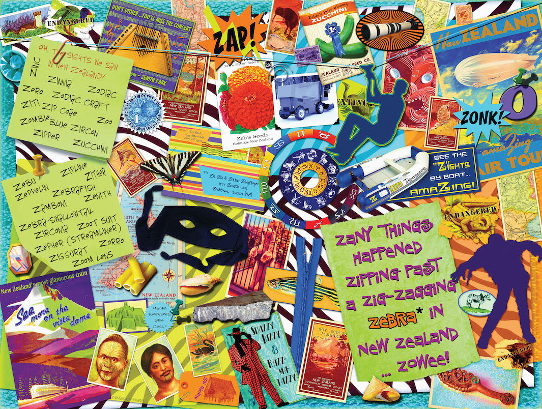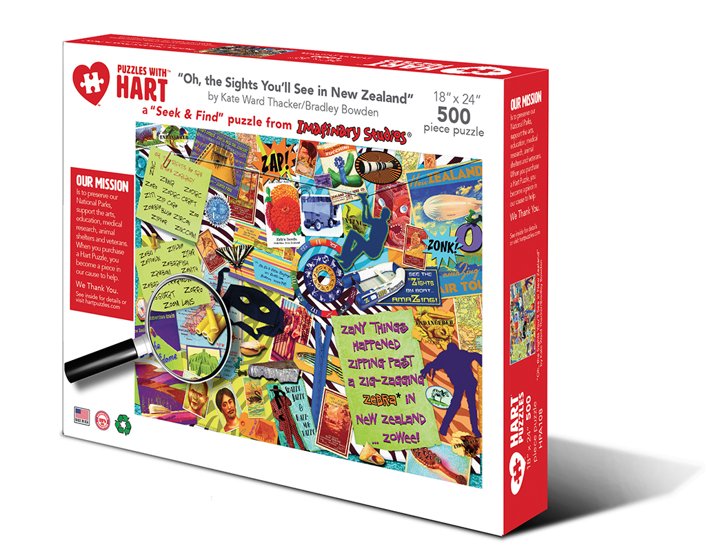 A zany, zesty, zealous, zip-lining zoom through the Pacific Islands of New Zealand. Explore the Sights of New Zealand with the letter 'Z' in this Seek & Find puzzle designed by Imaginary Studios. Zigzag with this 18”x 24” 500-piece puzzle designed by Imaginary Studios. By Kate Ward Thacker and Bradley Bowden