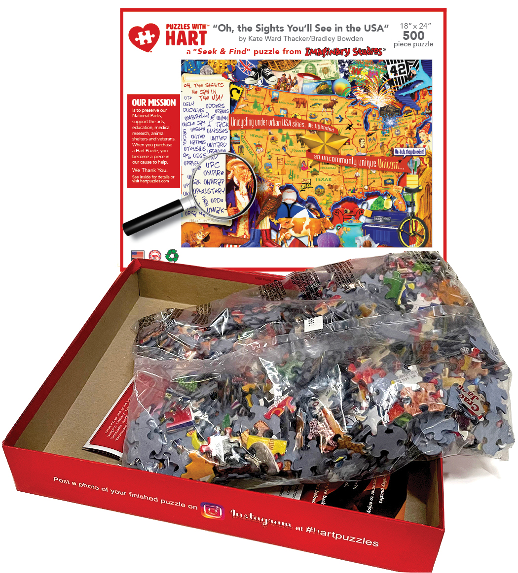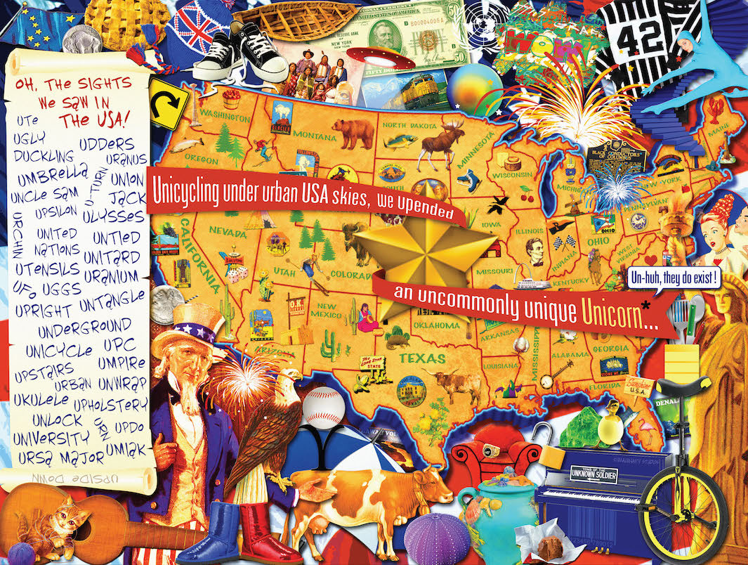50 reasons and 500 ways to discover the unbelievable, unusual, upmost, unique, unabashed look at the USA. Explore only using words starting with the letter ‘U’ in this Seek & Find puzzle designed by Imaginary Studios. So, unwrap this unassembled, ultra-fun 18”x 24” 500-piece puzzle designed by Imaginary Studios. By Kate Ward Thacker and Bradley Bowden