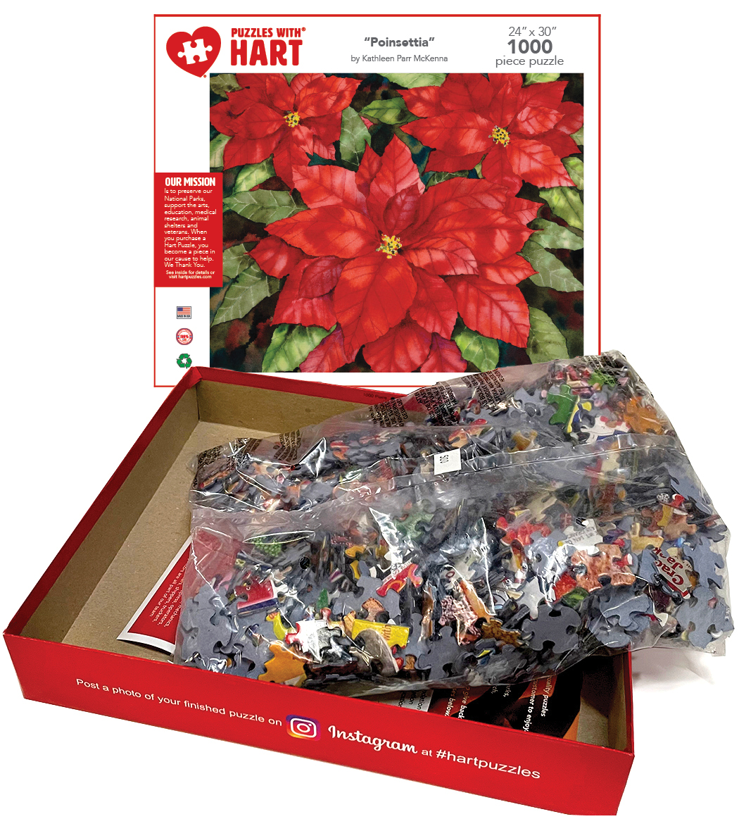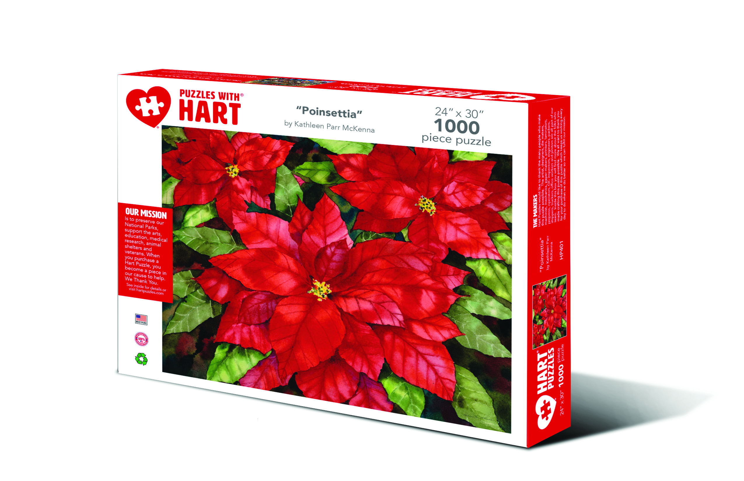 Poinsettia’s association with Christmas began in 16th-century Mexico, where legend tells of a girl, commonly called Pepita, who was too poor to provide a gift for the celebration of Jesus’ birthday, was inspired by an angel to gather weeds from the roadside and place them in front of the church altar. Crimson blossoms sprouted from the weeds and became poinsettias. The star-shaped leaf pattern is said to symbolize the Star of Bethlehem and the red color represents the blood sacrifice of Jesus’s crucifixion. Enjoy the Christmas flower in this 24”x 30” 1000 piece puzzle. By Kathleen Parr McKenna
