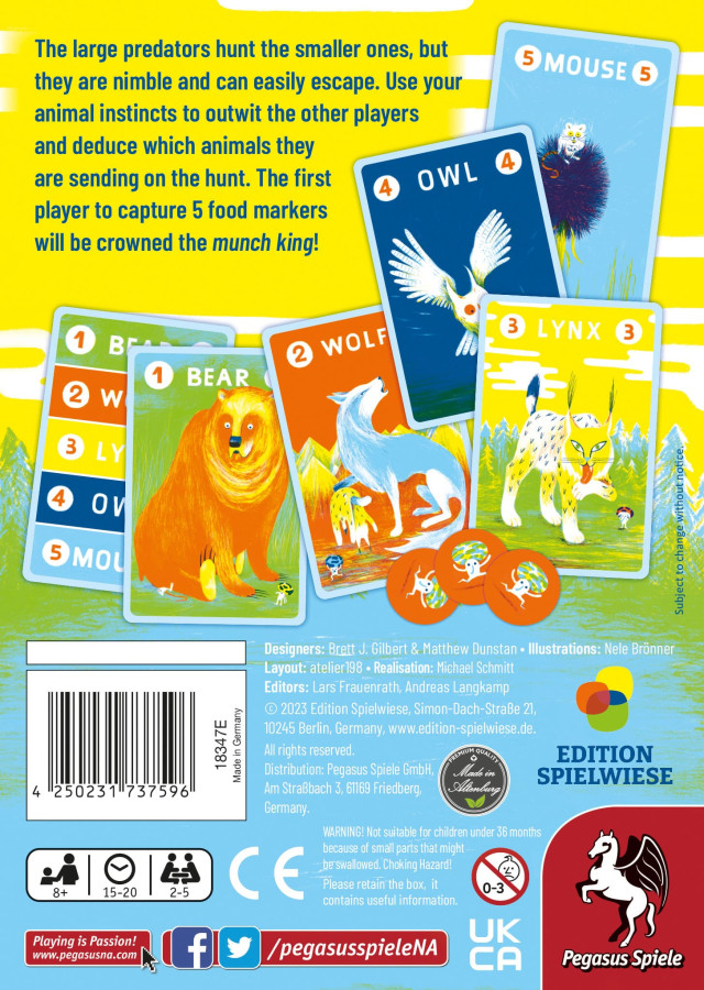 In Prey Another Day, players are forest animals hunting for food in the wilderness. Staring at the players around the table, you’ll need to deduce when it is safe to hunt and when to stay hidden. In each round, players secretly choose one of the cards in their hand to play face down—bear, wolf, lynx, owl, or mouse. From largest to smallest and starting with bear, each animal will be called in turn. If alone, that player can declare a smaller animal to hunt and all matching face-down critters are revealed and eliminated. The round ends when only one animal remains, or after three hunts. Survivors receive valuable food markers, i.e. victory points, and the first player to collect 5 points wins!