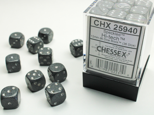 Each Set contains 36 Speckled Hi-Tech 12mm d6 dice with silver pips (DS1203) in 02804 Display Case w/Lid