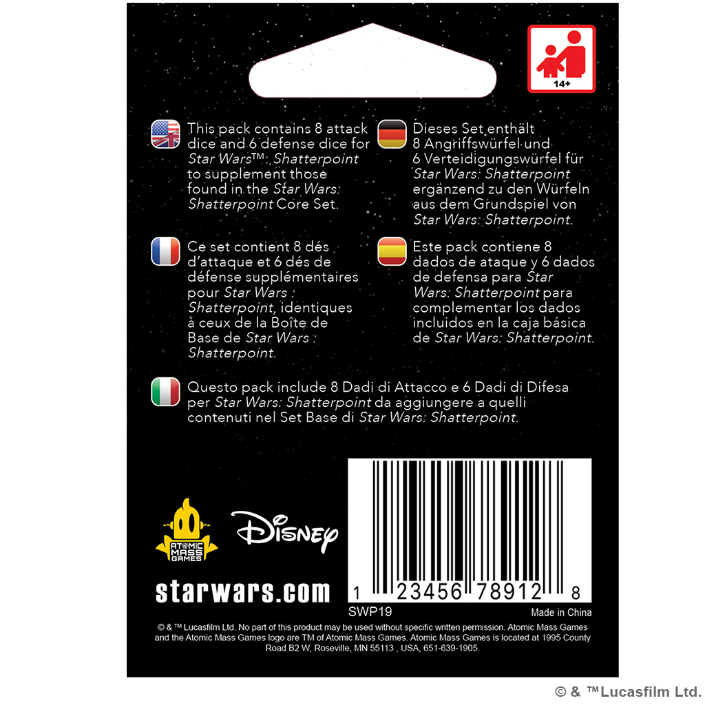 Players can supplement their collection of Star Wars: Shatterpoint with this pack. Containing 8 attack dice and 6 defense dice identical to those found in the Core Set, players can stay focused on their battlers no matter who’s in their squad.