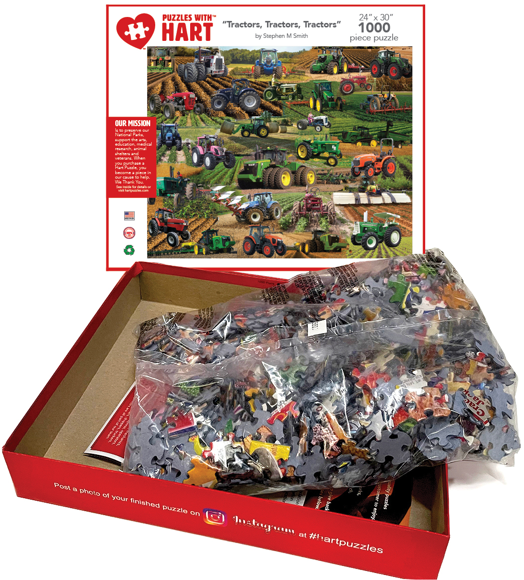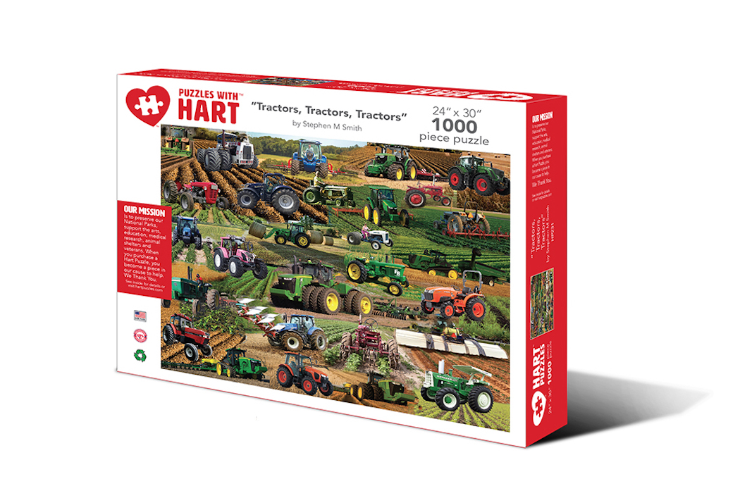 Tractors first emerged in the early 19th century when steam engines on wheels were used to help drive mechanical farm machinery using a flexible belt. The first portable steam engine used for agricultural purposes was invented by Richard Trevithick in 1812 and it was known as the Barn Engine. Since then John Deere, International Harvester and other manufacturers have made them a staple of farm operations. See your favorite in this 24″x 30″ 1000 piece puzzle. By Stephen M. Smith